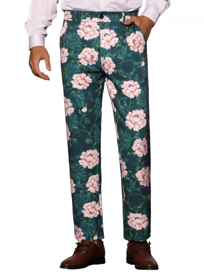 Lars Amadeus 花柄ペインティング フローラル ドレスパンツ フラットフロント パーティー プロム フラワー プリント スラックス メンズ グリーンピンク 30