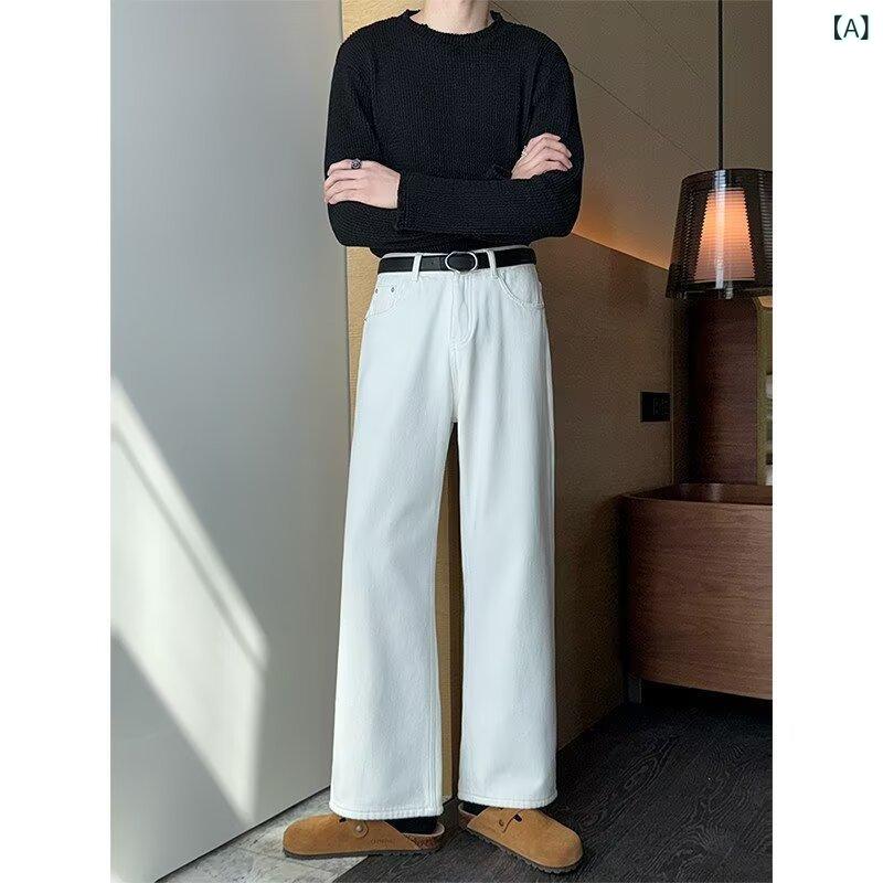 メンズ デニムパンツ ワイド ストレート メンズ デニムパンツ ワイド ストレート アメリカン ホワイトの メンズ ワイド レッグ ジーンズ ゆったりと 万能な 韓国 ストレート パンツ 万能な フロア レングス パンツ で カジュアル 男性