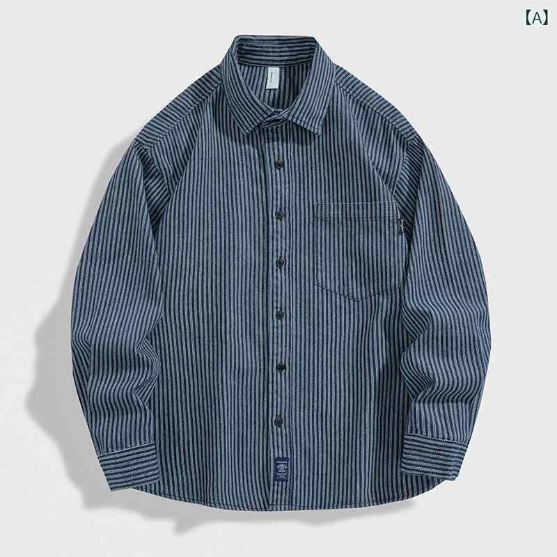 シャツ メンズ 男性用 長袖 ブルー ストライプ 襟付き 開襟 羽織り オーバーサイズ コットンブレンド イージーケア カジュアル 春秋
