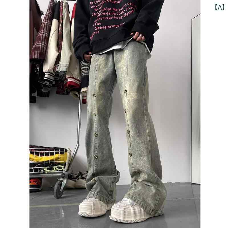 デニム パンツ メンズ 男性用 秋冬 コットン レトロ ウォッシュ加工 ユーズド加工 ゆったり ストレート ワイド 着痩せ フルレングス ロング丈 普段使い カジュアル トレンド