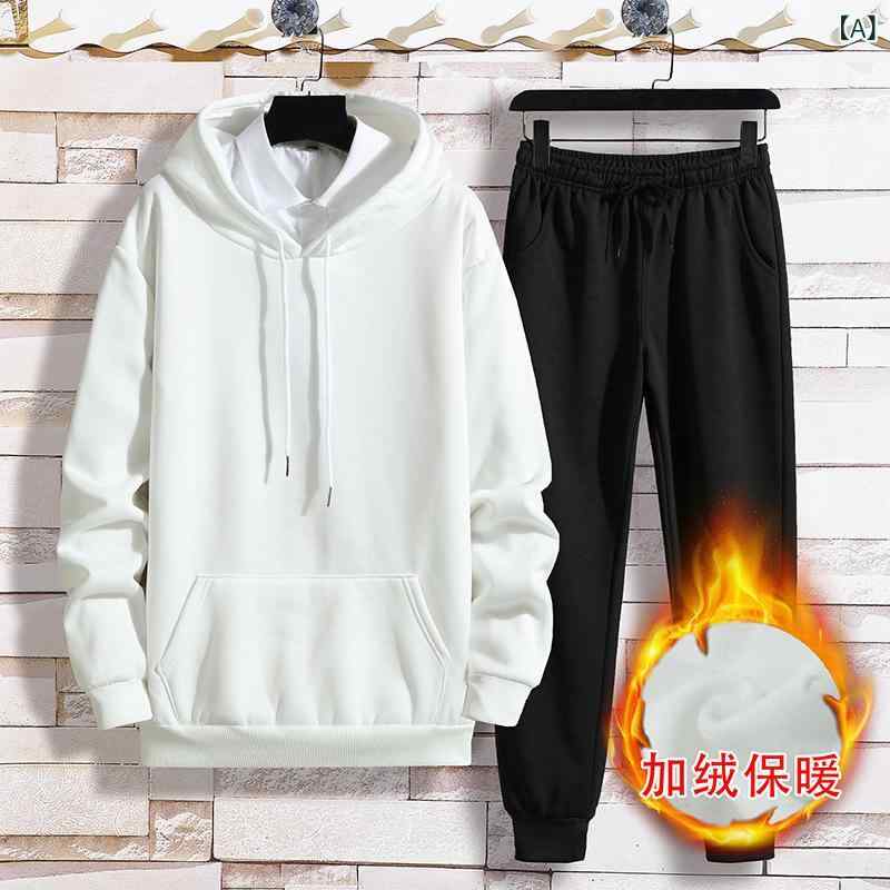 メンズ スウェット セット 冬 パーカー フード付き 長袖 トップス 長パンツ カジュアル スポーツ コットン混 ポリエステル 白 灰 黒 暖か 起毛加工 若者向け 普段使い