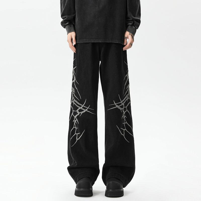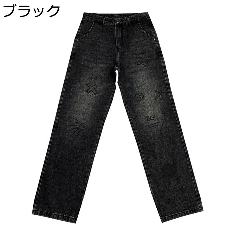 パンツ メンズ 刺繡 大人 デニム ロング 大きいサイズ ゆったり ワイド ジッパー ボタン ポケット 普段使い 外出用 カジュアル おしゃれ とげ 黒