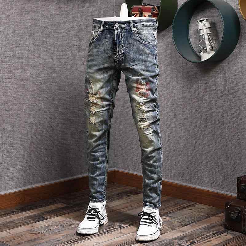 デニム パンツ メンズ ファッション 服 オシャレ シンプル 大人 かっこいい 大きいサイズ ストリート 紳士服 アメリカン レトロ ジーンズ パッチ スリムフィット ストレッチ 裾 パンツ