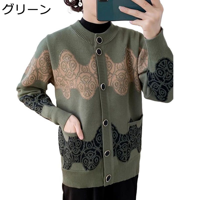 ニットカーディガン 婦人服 レディース シニア セーター 長袖 コート 前開き 厚手 暖かい アウター ジャケット ポケット付き 幾何柄 秋冬服 お出かけ 旅行 おばあちゃん 敬老の日 ギフト