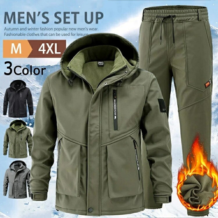 メンズ 防水 防寒 防風 自転車 厚手 撥水 ウインドブレーカー カジュアル 裏起毛 撥水 ジャンパー 上下セット マウンテンジャケット 裏起毛 ミリタリー ジャケット ワークパンツ スポーツ 防寒 作業用 登山 釣り キャンプ ランニング