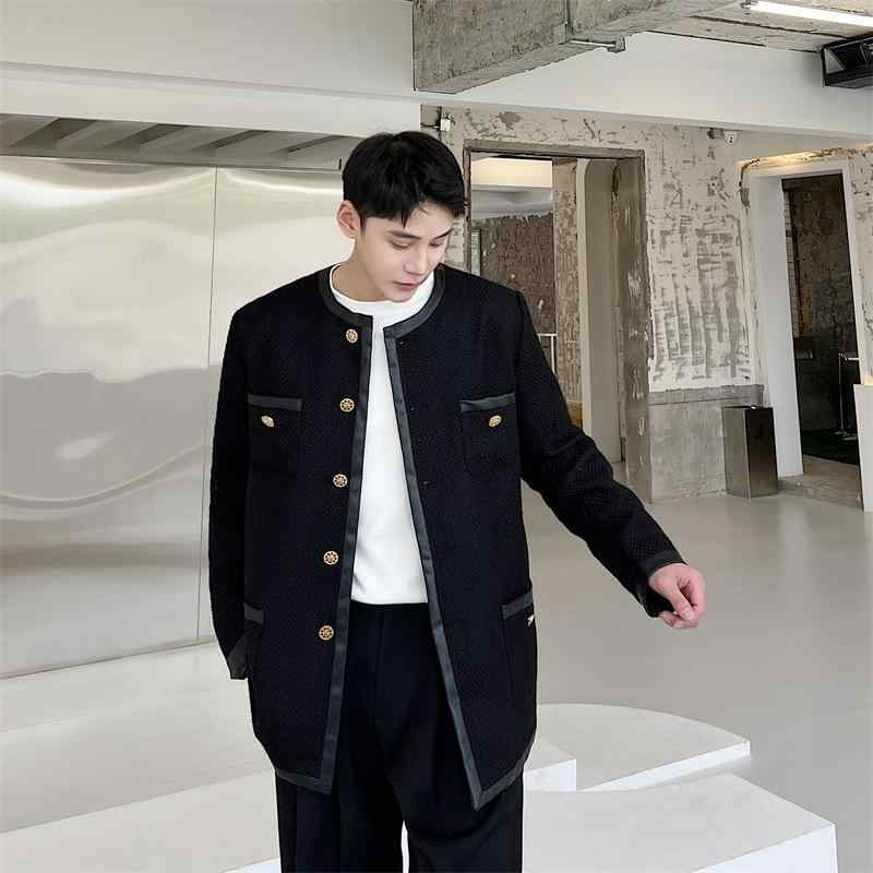 ジャケット メンズ フレンチレトロ クルーネック シングルボタン メタルボタン ポケット付き 編み込み柄 テクスチャー感 ポリエステル 春秋 カジュアル アウター ゆったり ブラック