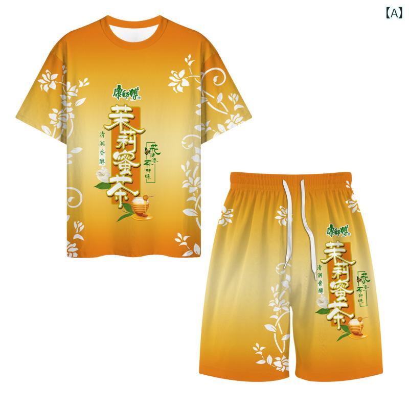 セットアップ 男女兼用 春夏 おもしろ パロディ ドリンク 3Dプリント クルーネック 丸首 半袖 Tシャツ ショートパンツ ポリエステル混紡 カジュアル ストリート 普段着 ルームウェア トレンド