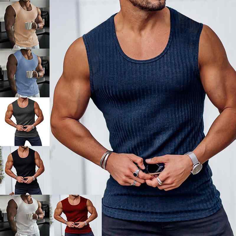 タンクトップ メンズ スポーツ ノースリーブ クルーネック タイトフィット リブ 無地 ポリエステル素材 コットンブレンド トレーニングウェア 薄手 夏用 ストレートヘム スポーツスタイル