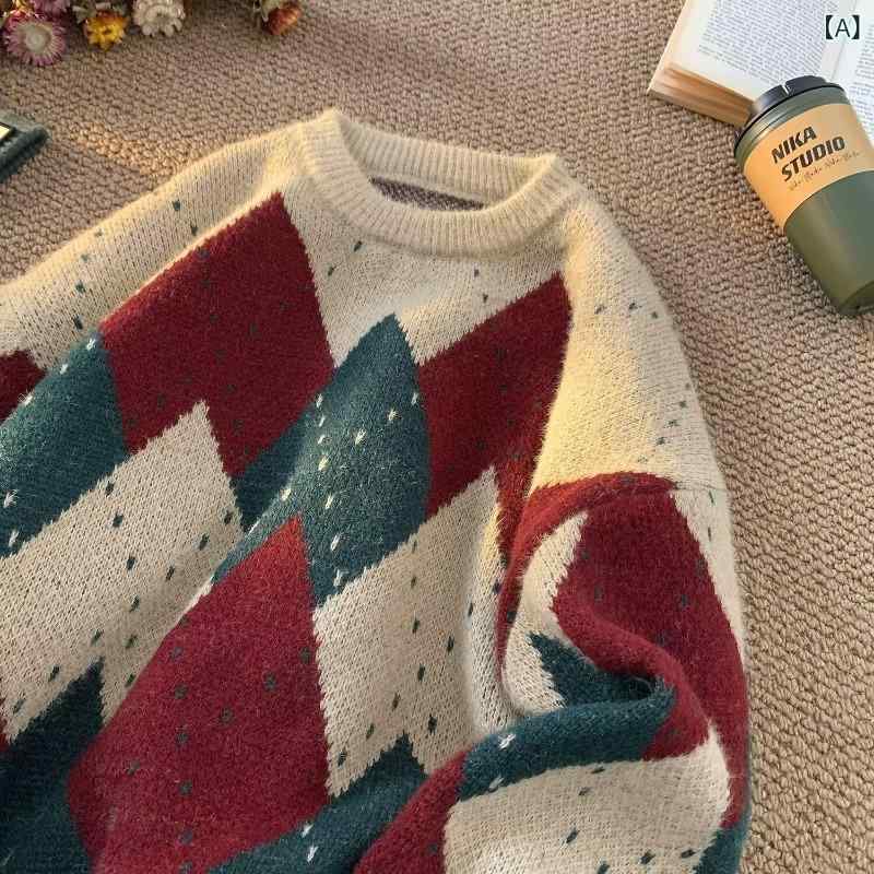 ニット メンズ アメリカンレトロ クリスマス柄 ミラードカラー アーガイルチェック 配色 切り替え ゆったり ルーズフィット 裏起毛 厚手 セーター カップル ペア トップス 冬物 綿フリース クルーネック カジュアル デイリー