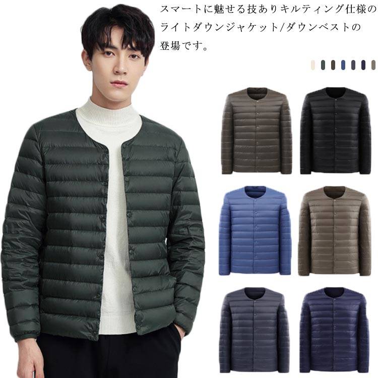 軽い割に暖かい!ダウンジャケット ダウンベスト メンズ ライトダウンジャケット 軽量 ダウンコート ダウン ジャケット ベスト アウター ノーカラー クルーネック Vネック 男性用 紳士 シンプル 無地 秋冬 おしゃれ