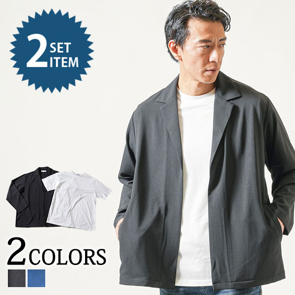 メンズ 秋 ジャケット tシャツ 2枚セット 梨地 ボタンレス 長袖 テーラードジャケット 半袖 クルーネック 白 無地 40代 50代 メンズファッション ファッション ちょいワルオヤジ イケオジ メンズカジュアルジャケット カジュアルジャケット 秋物 秋服 40代メンズ秋ジャケット