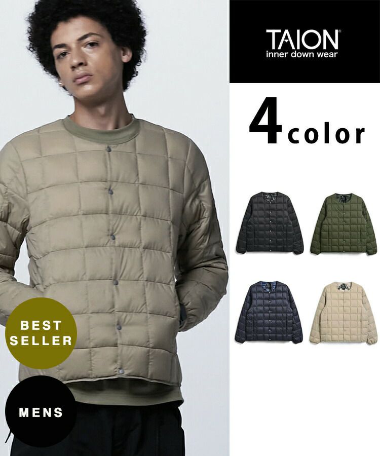 TAION/タイオン/taion/インナーダウン/ダウン/ダウンジャケット/ ※メーカー希望小売価格はメーカー商品タグに基づいて掲載しています。 インポートセレクトショップ/アメカジ/ストリート/海外ブランド/通販【エムズジーンズ/m's jeans】 トップページへ戻るTAION (タイオン)2015年に日本にて設立。TAIONはインナーダウンウェアブランド。TAIONのブランド名の由来は、体温(TAION)。成熟した水鳥のダウン(羽毛)を使用しており、羽毛本来の温湿度調整機能が非常に高く、羽毛特有の臭いも少ない優れたダウンに定評があるジャパンブランドです。TAIONは軽くて、暖かく、どの環境下でも着用しやすいデザインをこれからも最大限に追求していきます。 【商品説明】 軽くて使い易いシンプルなデザインが特徴のインナーダウン。羽毛は軽くて反発力の良い650フィルパワー以上のダウンを使用。羽毛の選定は成熟した白鳥の羽毛を用いているので、ダウン特有の臭いも少ない優れたダウンになっています。表地は高密度400T以上のタフタに超撥水高密度ナイロンを使い撥水だけでなく汚れも付きにくい生地に仕上がっています。両脇にはファスナーポケットを配置。オリジナル収納袋が付いているので、コンパクトにして持ち運びができ、外出や旅行にも利便性が高い一枚。TAIONのインナーダウンジャケットは、アウターの中側、Tシャツやパーカーなどの外側にも気軽に使える秋冬のおすすめアイテムです。 【BRAND】 TAION/タイオン 【ID】 TAION-104(KHAKI/BEIGE/GREEN BLUE/NAVY/BLACK) 【生産国】 CHINA 【素材】 表地 - ナイロン:100%中綿 - ダウン:90%×フェザー:10%(ダウン:95%×フェザー:5%)※生産時期により異なります。裏地 - ポリエステル:100%(軽くて反発力の良いダウン素材使用) 【モデル】 178cm/68kg/Lサイズ着用(BEIGE/NAVY/BLACK)178cm/68kg/Mサイズ着用(KHAKI) 肩幅 袖丈 身幅 着丈 M 43.5 62 52.5 64 L 44.5 63 55.5 66 XL 45.5 64 58.5 68 ※原材料価格の高騰により2025年入荷商品より値上がりしております。※生産時期の違いにより、ブランドタグや下げ札が異なる場合がございます。ご了承の上、お買い求めくださいませ。 ※本商品の表裏面共に、薄くて軽いダウンに適した生地を使用している為、生地が淡い色の場合、中側のダウンの色が生地から透けてシミのように見えることがございます。 ※ホワイトグースを使用しておりますが天然ならではの濃い色の羽が混ざる事がございます。こちらは不良品ではございませんので、予めご了承ください。 ※お客様がお使いのディスプレイによっては商品の色合いが若干違う可能性がございます。 極力、実際の商品と同じになるように調整しています。 また商品一点一点につき若干の個体差がある場合がございます。ご了承くださいませ。