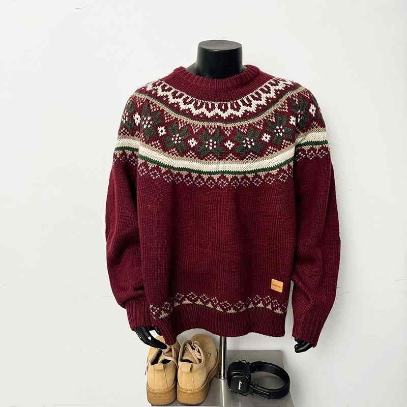 ニット メンズ 民族風 ジャガード柄 プルオーバー レッド 赤 クルーネック 長袖 ゆったり リラックスフィット 高弾力 高級感 秋冬 カジュアル ポリエステル 化繊混紡 オーバーサイズ