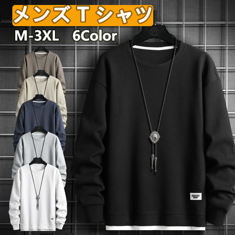 ワッフル ロンT メンズ プルオーバー 長袖Tシャツ 無地 tシャツ カジュアル クルーネック ルームウェア パジャマ 重ね着風 Tシャツ ロングTシャツ ティーシャツ トップス おしゃれ 薄手 トレーナー 春 春服 秋 秋服 ユニセックス 男女兼用