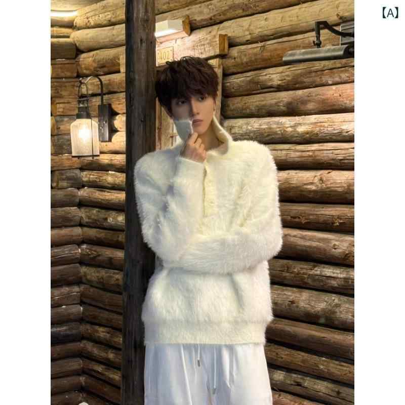 ニットプルオーバー 男女兼用 秋冬 韓国ファッション トレンド 雰囲気 ゆったり 柔らか もちもち 伸縮性 襟付き ポロカラー フェイクミンク ファー コットン ビッグシルエット カジュアル トップス