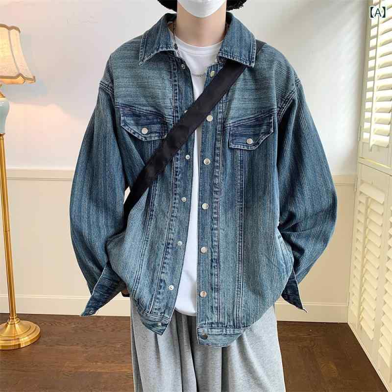 ジャケット メンズ レトロ ストライプ ウォッシュドデニム グラデーション ハイストリート ゆったり オーバーサイズ ストリート トレンド カップル ブルー カジュアル 綿 コットン 長袖 襟付き 秋 韓国ファッション