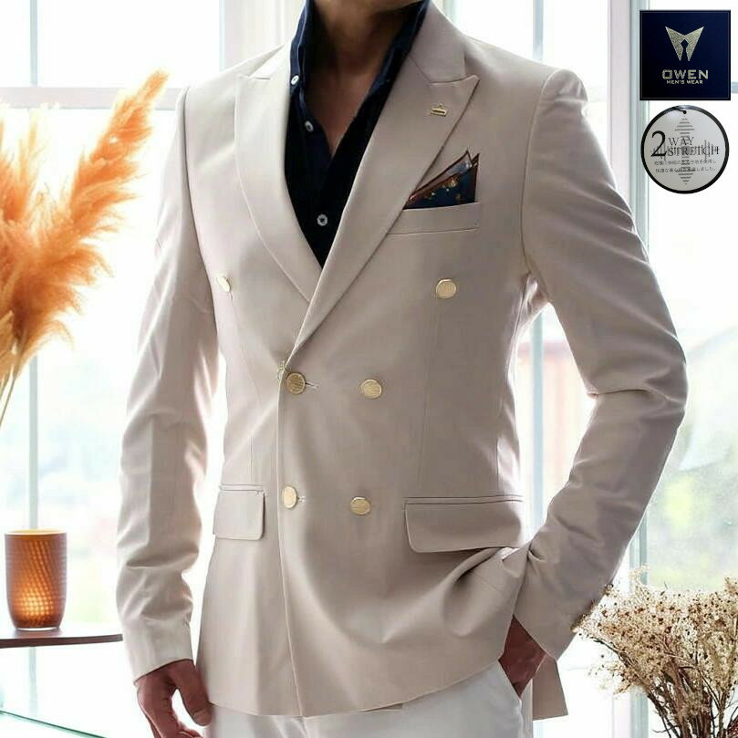 ブレザー ダブル 金ボタン テーラードジャケット 6つボタン ベージュ ストレッチ 春/秋/冬 メンズ ジャケパン ビジネスジャケット 大きいサイズも入荷