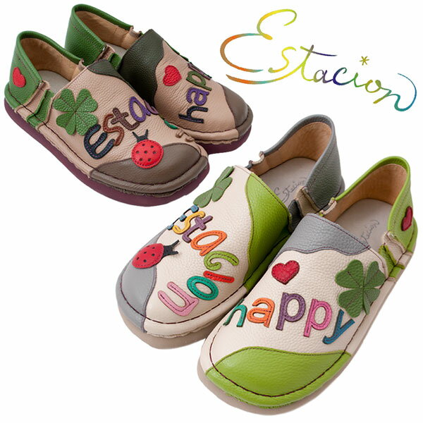 estacion エスタシオン TGE445 レディース コンフォートシューズ 本革 四葉のクローバー てんとう虫 左右非対称 ハート Happy ウェッジソール クッション抜群 可愛い 痛くない 疲れにくい レザー グリーングレー カーキコンビ /TB/MR