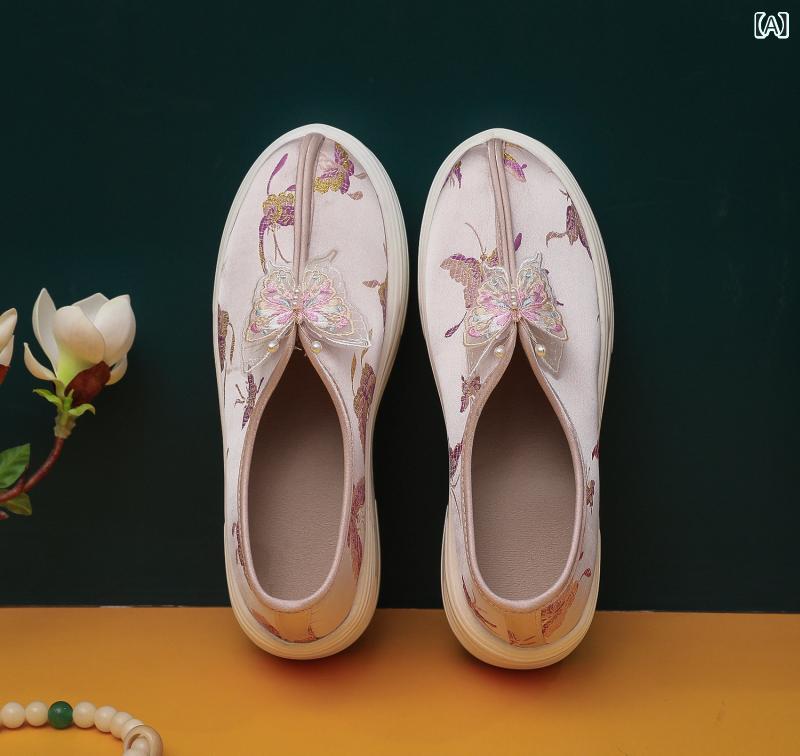 パンプス レディース 厚底 ラウンドトゥ スリッポン コットン素材 ソフトソール スタイルアップ効果 中華レトロ 漢服 時代衣装 馬面スカート チャイナドレス コスプレ 普段使い 蝶々 ビーズ装飾