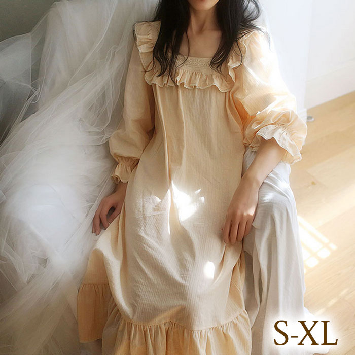 ルームウエア 部屋着 パジャマ ナイトウエア ネグリジェ ワンピース 長袖 姫系 ロング丈 フリル マタニティー 涼しい リラックス かわいい 送料無料