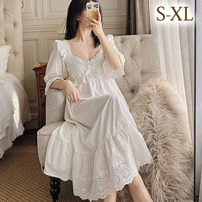ネグリジェ 白 ロング 姫系 長袖 綿 レディース ワンピーパジャマ 無地 シンプル 春夏用 部屋着 寝間着 便利服 薄手 ルームウェア ゆったり 柔らか 日常 かわいい 通気 家着 大きいサイズ ホ