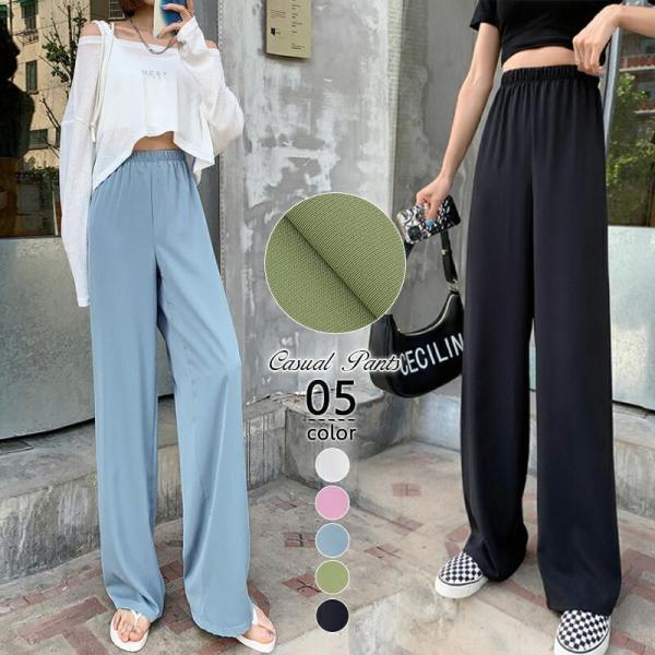 ワイドパンツ ハイウエスト カラーパンツ ウエストゴム ボトムス レディース セミワイドパンツ パンツ ズボン スラックス おしゃれ 無地 大人