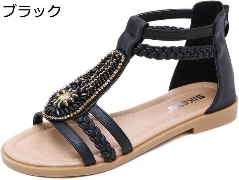 サンダル 大きいサイズ レディース アンクルストライプ ラインストーン ボヘミアン ヴィンテージビーズ 編みサンダル エスニック系 おしゃれ ローヒール T-ストラップ 美脚 カジュアル レザーサンダル