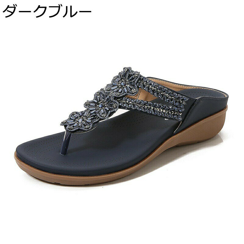 トングサンダル 大きいサイズ レディース サンダル 花飾り ボヘミアン ヴィンテージ ビーズ ビーサン ウェッジヒール ビーチサンダル 美脚 婦人 柔らかい クッション性 スリッパ アウトドア 疲れない