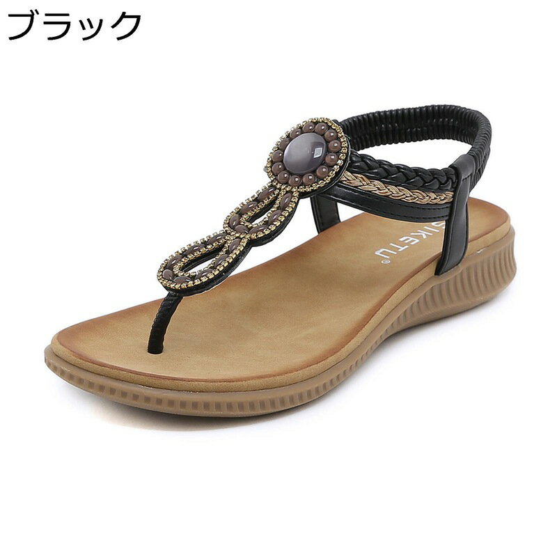 レディースサンダル 大きいサイズ トングサンダル T-ストラップ ボヘミアン ヴィンテージ ビーズ エスニック風 ウエッジソール 編み込みストラップ ビーチサンダル カジュアル 美脚 アンクルゴム