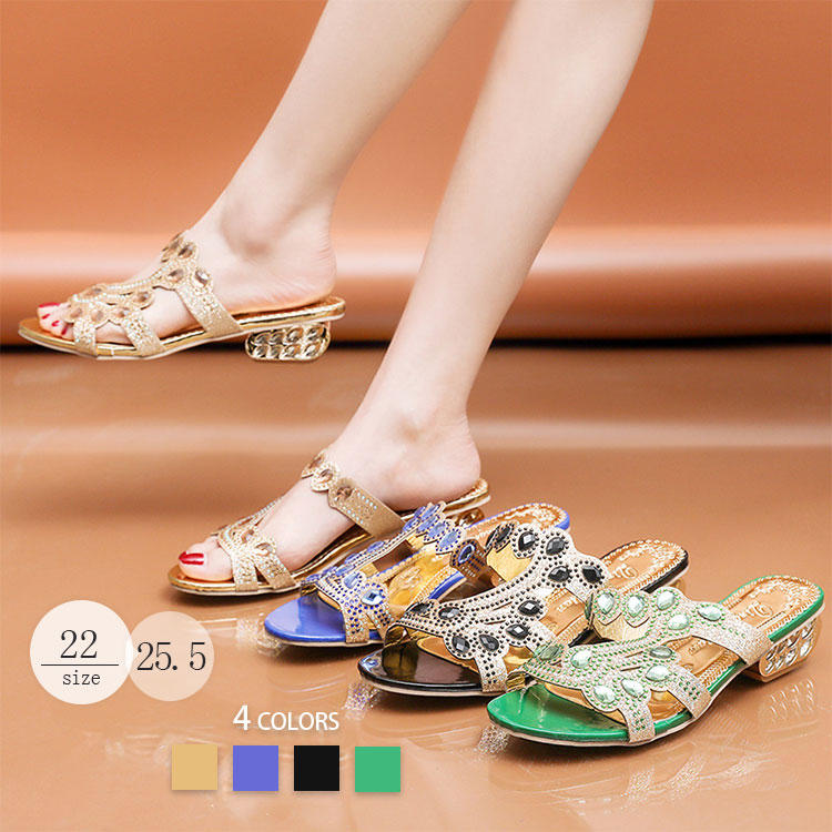 レディース サンダル ビーチサンダル サボ 歩きやすい 上品 チャンキーヒール 疲れない 3センチヒール キラキラ 30代 40代 50代 ゴルード ブルー グリーン ブラック 大きいサイズ オープントゥ ダイアモンド ミュール