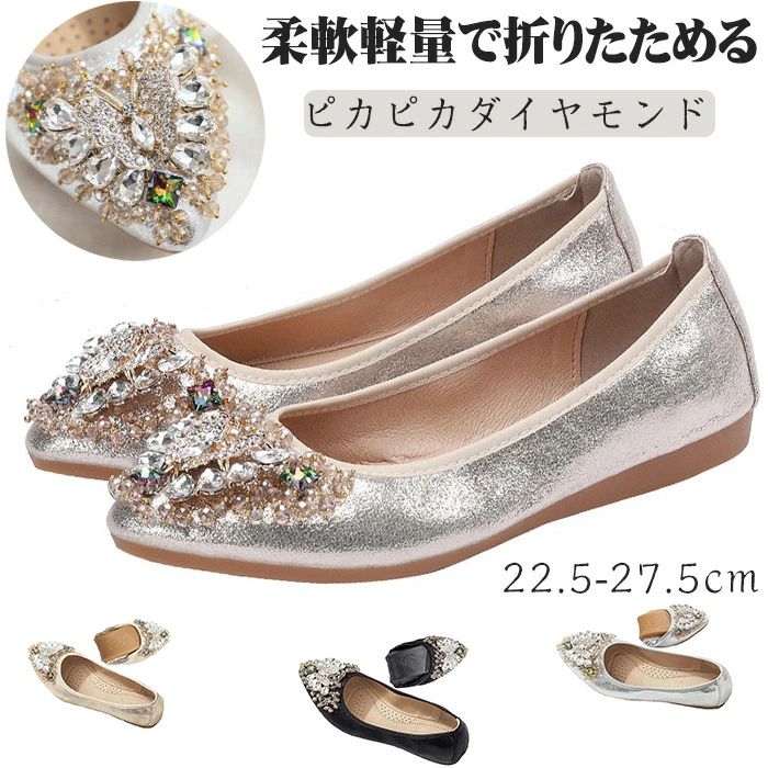 【送料無料】バレエシューズ レディース シューズ 携帯パンプス ぺたんこ ローヒール 折り畳みシューズ ソフト柔らかい 軽量履き心地 歩きやすい靴 お洒落キラキラダイヤモンド可愛い 女?