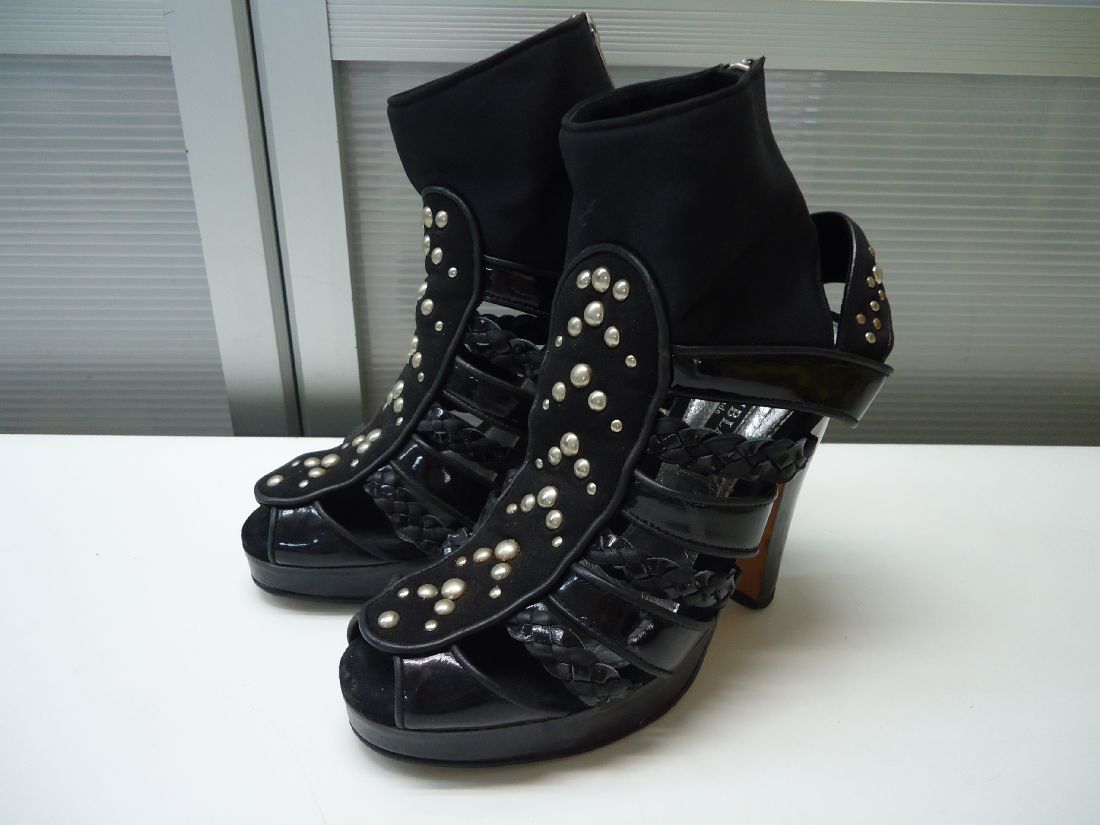 ◆「あす楽」対象外の配送方法をお選びの場合は、ご購入時に「あす楽」のチェックをお外し下さい◇「あす楽」ご希望の場合は必ずお読み下さい◇「あす楽」配送会社・・・全国通常「佐川急便(佐川航空便)」※ただし、北海道内は「佐川急便(佐川航空便)」または「ゆうパック」配送といたします。(配送会社は、お選びいただけません)※ご購入手続き画面で、「宅配便(佐川急便)」をお選びいただいていない場合は、「あす楽」対象外となりますのでご注意ください。◇沖縄本島は「あす楽」対象ですので、翌日到着できる場合があります。お問い合わせ下さい。◇離島や一部地域では対象外となる場合があります。◇複数購入時の送料◇複数の商品をご購入していただいても、送料に変更はありません。(複数ご購入の場合も一足分の送料のみとなります)※料金は、「あす楽」や「あす楽」以外といった配送方法により異なります。※ただし、同梱発送限定とさせていただきますのでご了承ください。◇同梱発送の配送会社は、「佐川急便」、「西濃運輸」、「ゆうパック」といたします。(配送会社は、お選びいただけません)【メーカー】TRISTANBLAIR(トリスタンブレア)【商品名】ブーツサンダル【サイズ】表記サイズ サイズ:35(22.5cm相当)実寸 ヒール高:約12cm ストーム:約2.5cm*数字は実測値ですので多少の誤差はご了承下さい。【色】ブラック【素材】繊維素材エナメル調合成皮革【状態】商品ランク ランクC※シルバーの装飾部分に経年劣化による薄い変色がありますが、全体的な状態は良好です♪※中古のお品ですので使用感、小キズ等ございます。ご理解ご了承ください。【商品ランクのご説明】M・・・未使用品A・・・新品同様B・・・美品C・・・使用感有D・・・ダメージ有E・・・使用に支障有(ジャンク品)【商品説明】☆後にファスナーが付いていて脱ぎ履きするタイプです♪☆ハンドメイドのブーツサンダルです♪☆個性的なデザインがステキです♪
