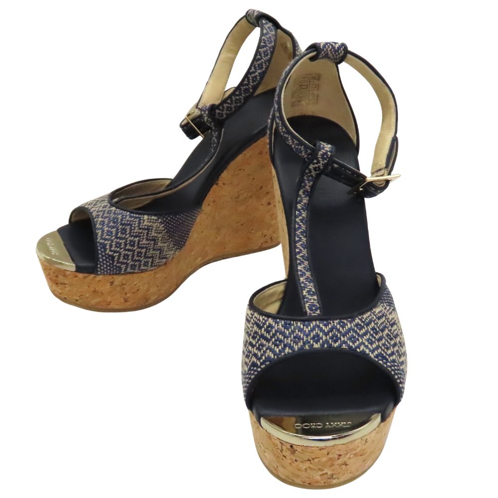 【中古】JIMMY CHOO ジミーチュウ サンダル 38 25.0cm ウェッジソール ネイビー レディース アンクルストラップ コルク 厚底 12cmヒール 美脚サンダル A2300663【無料ギフトラッピング承ります】