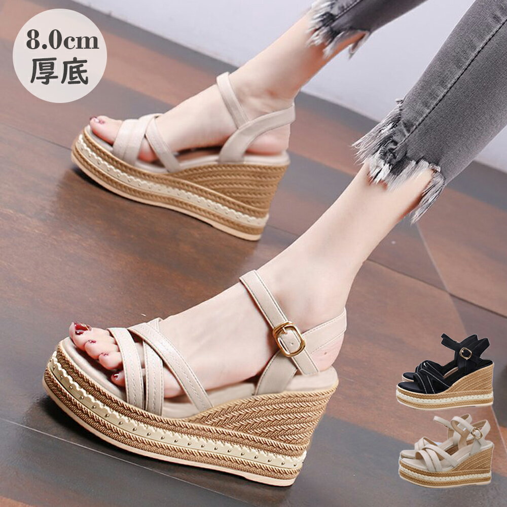 【最大50%OFFクーポンで,2495円】ウェッジソールサンダル 美脚厚底サンダル クロスベルト 軽量サンダル 韓国 アンクルストラップ サマーサンダル 歩きやすい お洒落 夏靴 8cmヒール 脚長綺麗目 miniministore 83RAJL-009