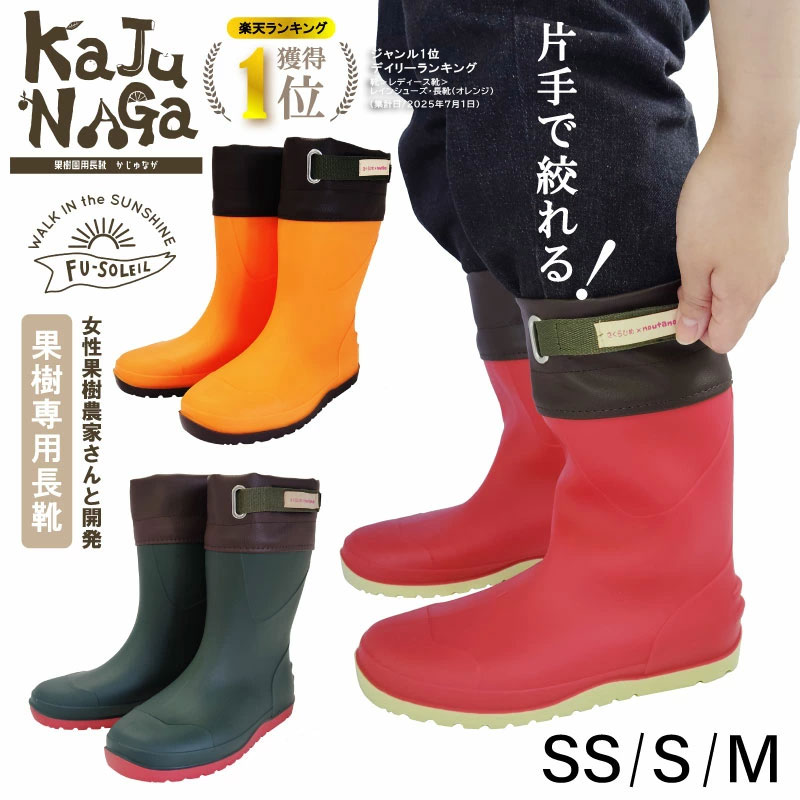 [みかんとりんごの果樹農家さんの欲しいを基に商品化! ] 女性果樹農家グループさんと、作業しやすい果樹専用長靴を共同開発!一般の農業用長靴より5センチほど丈が短い設計です。気分が上がるカラーバリエーションと片手で履き口を調節できて、脱ぎ履きしやすい実用性を追求した長靴ができました。 [特長] 〇片手で履き口を絞れるワンタッチ仕様。 履き口が緩んでも片手で調節できるから作業を止めずに使える快適さ マジックテープだからその都度サッと絞められます。 〇現場で快適に使えるデザイン設計 お手入れしやすく劣化に強いPVC素材を使用。 ソールは滑りにくく、地面に転がる落下作物を踏んでも痛くないフラット底。 〇足にやさしく疲れにくいクッションインソール 包み込まれるような安定感で作業中の足の負担を軽減します。 [商品仕様] カラー:りんごレッド / リーフグリーン / みかんオレンジ サイズ:SS(22.5-23.5)/S(23.5-24.5)/M(24.5-25.5) シーン:果樹園:ガーデニング、農業、 雨の日、イベント、ワークショップ 素材:PVC ブランド名:KaJuNAGA かじゅなが