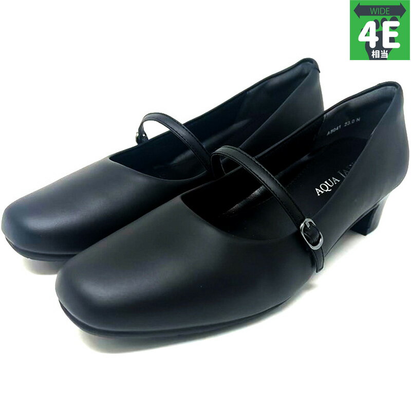 4E 幅広 ワイド アクアレディ レディース パンプス 靴 シューズ 結婚式 葬式 冠婚葬祭 フォーマル オフィス ビジネス リクルート 仕事 就活 ベルト付き ブラック 黒 送料無料 AQUA LADY 8041