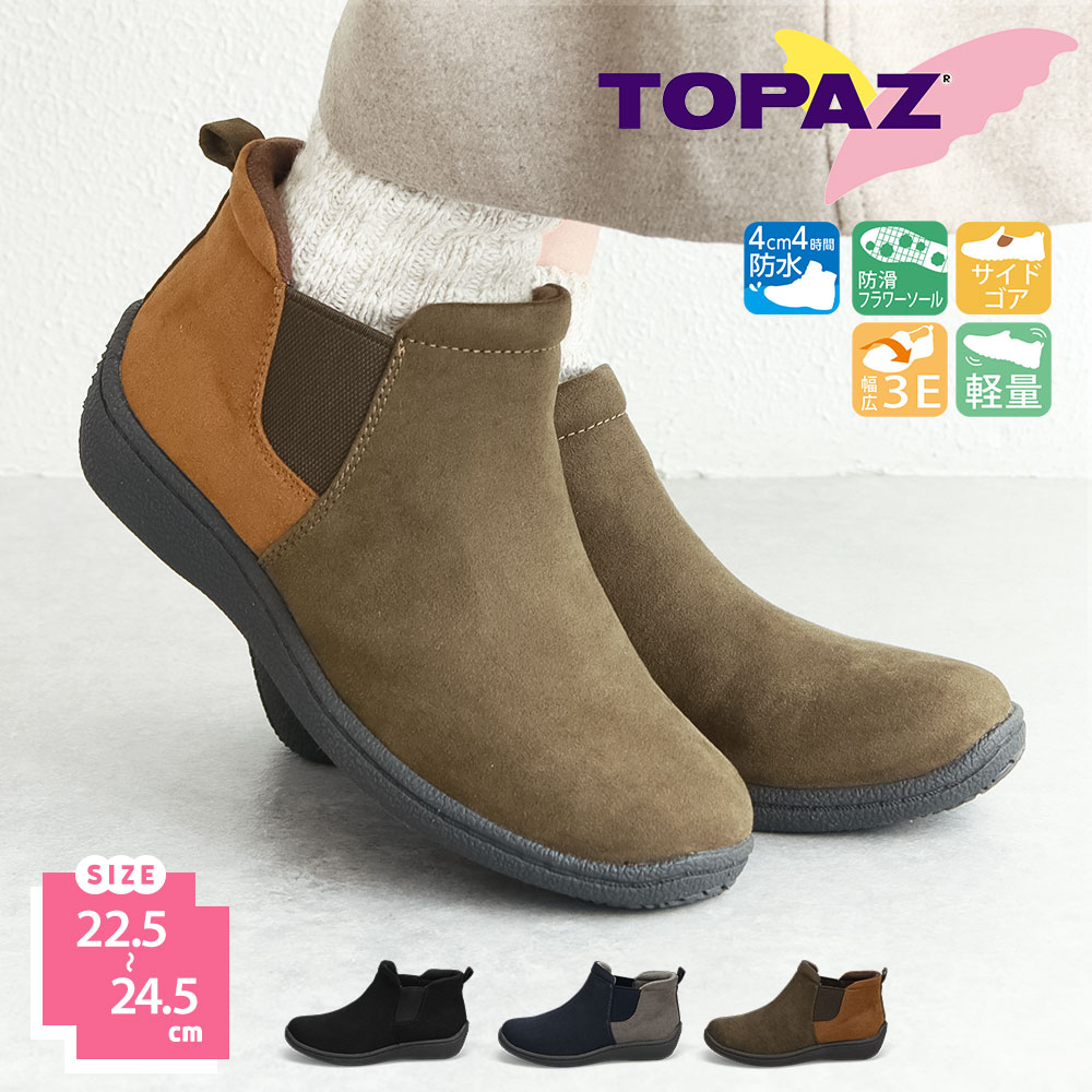 トパーズ ショートブーツ レディース 歩きやすい 防水 防寒 防滑 軽量 幅広 3e スエード ブーティ ローヒール 防寒 軽い 暖かい あったか 裏起毛 サイドゴア スノーシューズ レインブーツ レインシューズ 履きやすい ブーツ 黒 ブラック 2301
