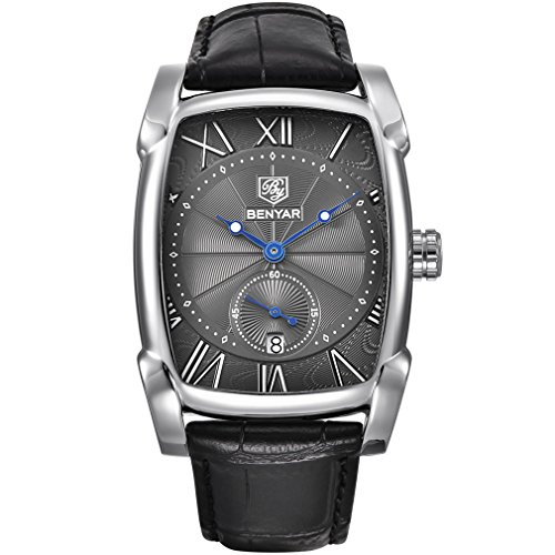 【中古】【未使用・未開封品】BENYAR 防水クラシック長方形ケース ヴィンテージデザインウォッチ レザーストラップ ビジネスカジュアル腕時計 メンズ A-Black-B