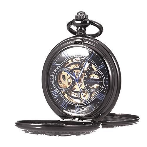【中古】【未使用・未開封品】SIBOSUN 懐中時計 スケルトン 機械式 ダブルケース 手巻き ローマ数字 アンティークチェーン メンズ, 3 ブラック ブルー, 機械式。