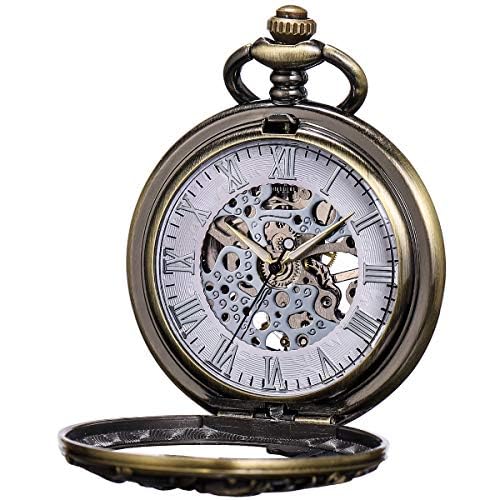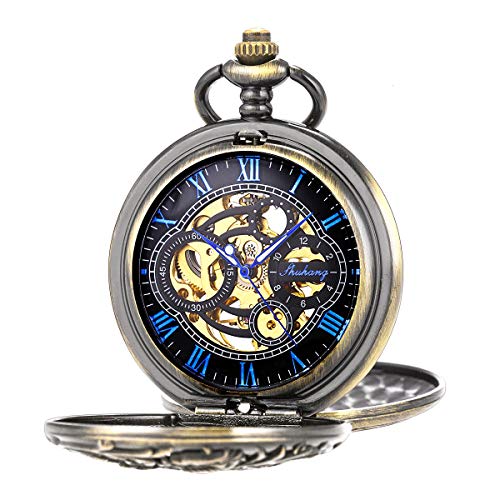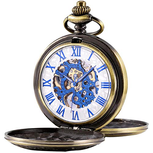 【中古】【未使用・未開封品】SIBOSUN 懐中時計 スケルトン 機械式 ダブルケース 手巻き ローマ数字 アンティークチェーン メンズ, 2 ブロンズブルー, 機械式。
