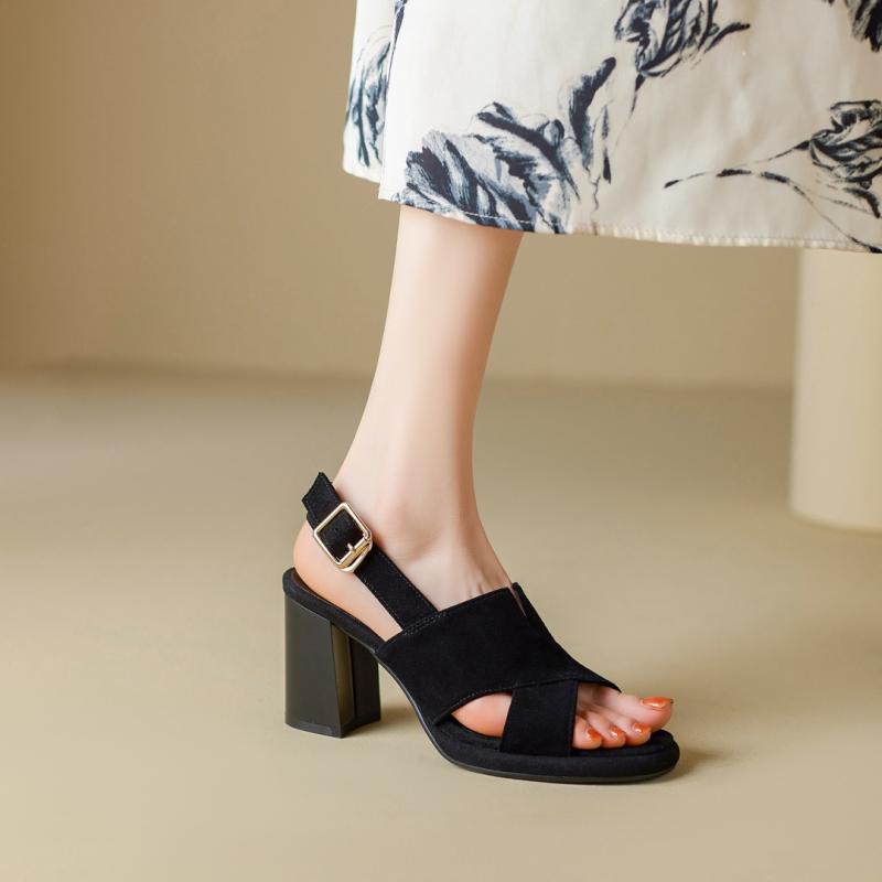 ・カラー: ブラック・サイズ: 33, 34, 35, 36, 37, 38, 39, 40・甲材: スエード・カテゴリ: サンダル・スタイル: 韓国風・つま先の形状: 魚口・靴底素材: ゴム・裏地素材: 豚革・留め具の種類: バックル