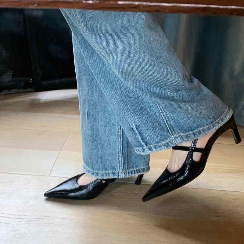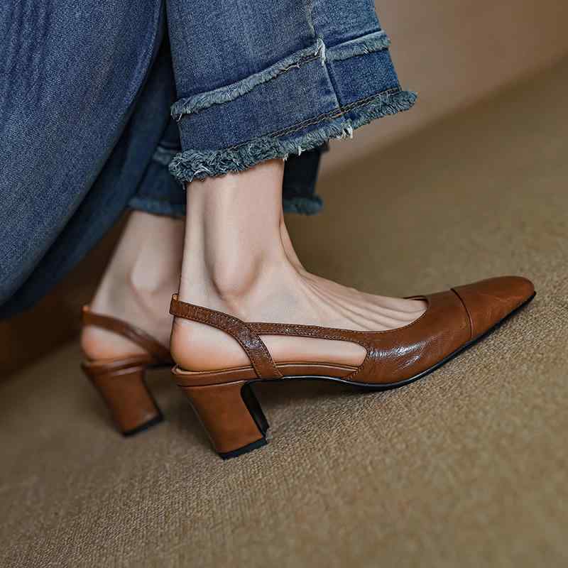 ・カラー: ブラック・サイズ: 35, 36, 37, 38, 39, 40・靴の高さ: 平底2cm, 高跟5cm・甲材: 牛革・カテゴリ: 包頭后空凉鞋・つま先の形状: 尖頭・スタイル: エレガント・靴底素材: ゴム・裏地素材: 羊革・履き方: バックル