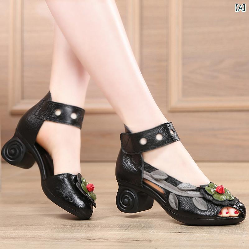 革靴 レディース おしゃれ 夏 エスニック シューズ 革 ママ シューズ ミドル ヒール フィッシュ マウス 滑り くい レトロ ダンス シューズ ローマン サンダル