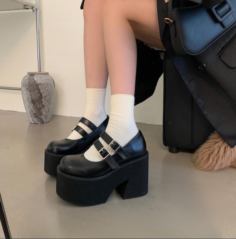 マリージェーンシューズ レディース スクールスタイル ヨーロピアンカジュアル プラットフォーム 厚底 ハイヒール ラウンドトゥ チャンキーヒール 太ヒール バックル ストラップ フェイクレザー ブラック パンプス