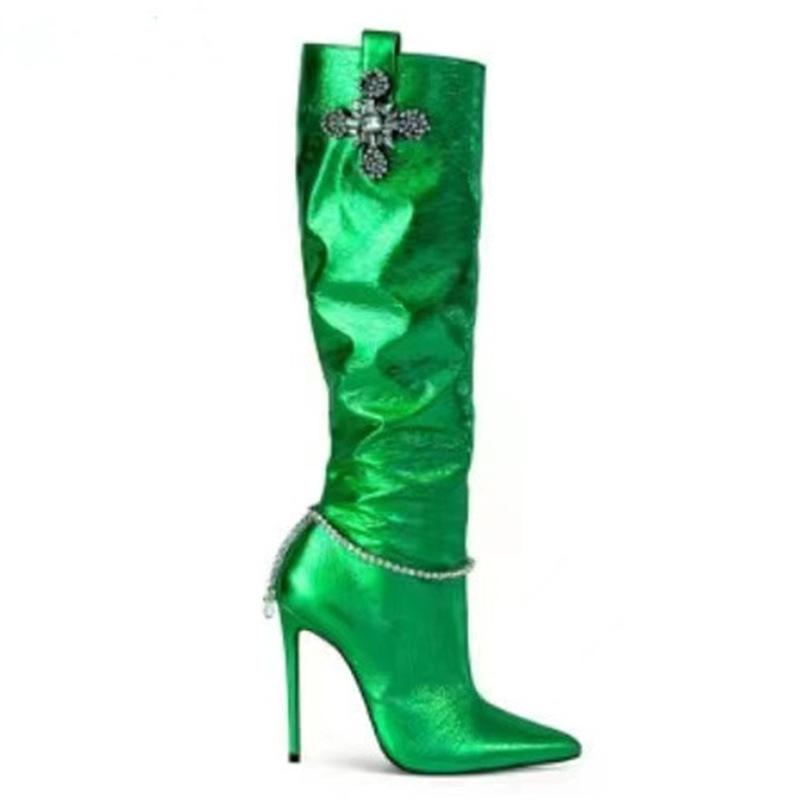 ・カテゴリ: ファッションブーツ・対象: 成人・アッパー素材: 超繊維・ソール素材: ゴム・性別: 女性・スタイル: 欧米風・つま先形状: ポインテッドトゥ・ヒール形状: スティレットヒール・ヒールの高さ: 8cm以上・ブーツ種類: ファッションブーツ・人気要素: ラインストーン・機能: 脚長効果・筒丈: ハイカット・厚さ: 通常・着脱方法: サイドジップ・柄: 無地・インソール素材: PU・内側素材: 合成皮革・シャフト内側素材: PU・シャフト素材: 超繊維・総重量: 約1kg・ソール製法: セメンテッド・カラー展開: ブラック、ブルー、グリーン、レッド・サイズ展開: 34、35、36、37、38、39、40、41、42、43