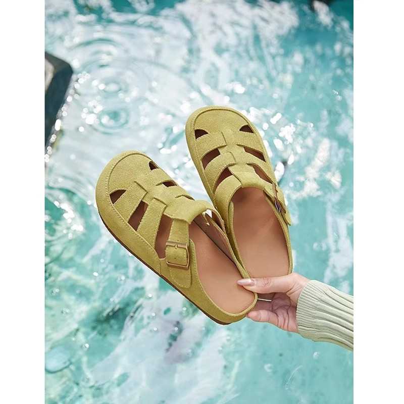 ローマ青空 牛反絨透かし彫りローマサンダル女性夏新型フラットヘッドスリッパ