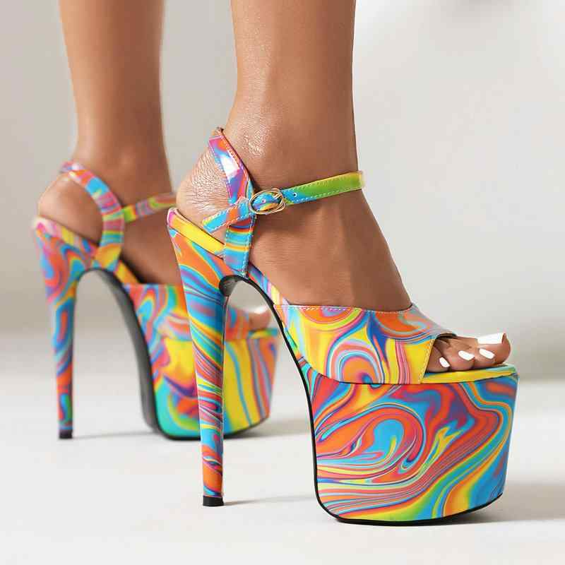 サンダル レディース 女性用 17cm 超ハイヒール ピンヒール 厚底 プラットフォーム オープントゥ セクシー ステージ ポールダンス ランウェイ モデル ドレスシューズ イベント 合成皮革 ブラック レッド ヒョウ柄 春夏