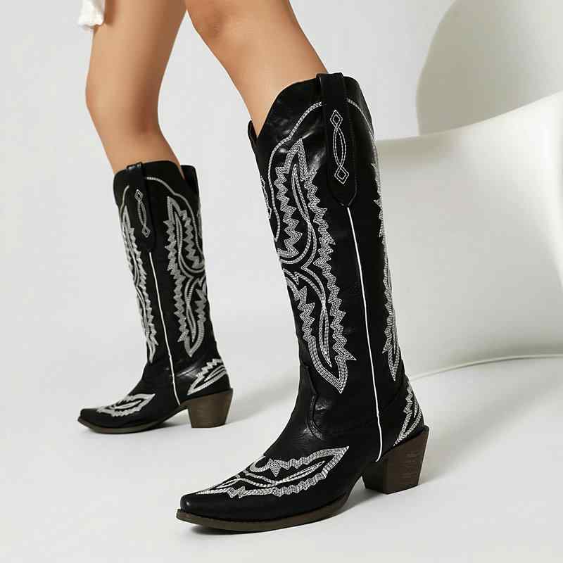 ブーツ レディース 女性用 レトロ 英国風 スクエアトゥ チャンキーヒール 太ヒール ハイヒール 刺繍 プルオン 厚底 ジョッキーブーツ ライダーブーツ PUレザー ロングブーツ 秋冬 カジュアル 通勤