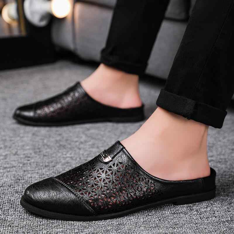 かかとなし シューズ メンズ ハーフ スリッパ スリッポン つっかけ オフィス 履き替え 夏 ヒールレス ポインテッド レザー 通気性 快適 フラット 黒 茶 白