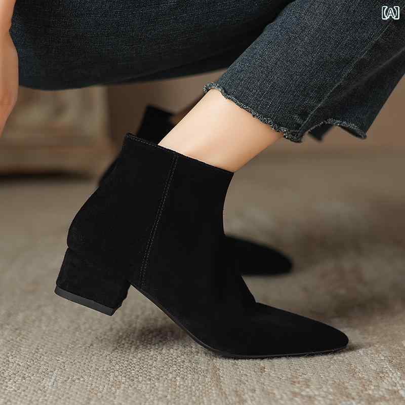 ・カテゴリ: ショートブーツ・対象: 女性用・スタイル: シンプル・主な素材: スエード・トゥ形状: ポインテッドトゥ・ヒール形状: チャンキーヒール・ヒール高: 1-3cm・筒丈: ロータイプ・厚み: 標準・着脱方法: サイドジッパー・柄: 無地・適合季節: 冬、春、秋・インソール素材: 人工毛・内張り素材: 人工フランネル・カラー展開: ブラック、ブラウン・サイズ展開: 34、35、36、37、38、39、40、41、42、43
